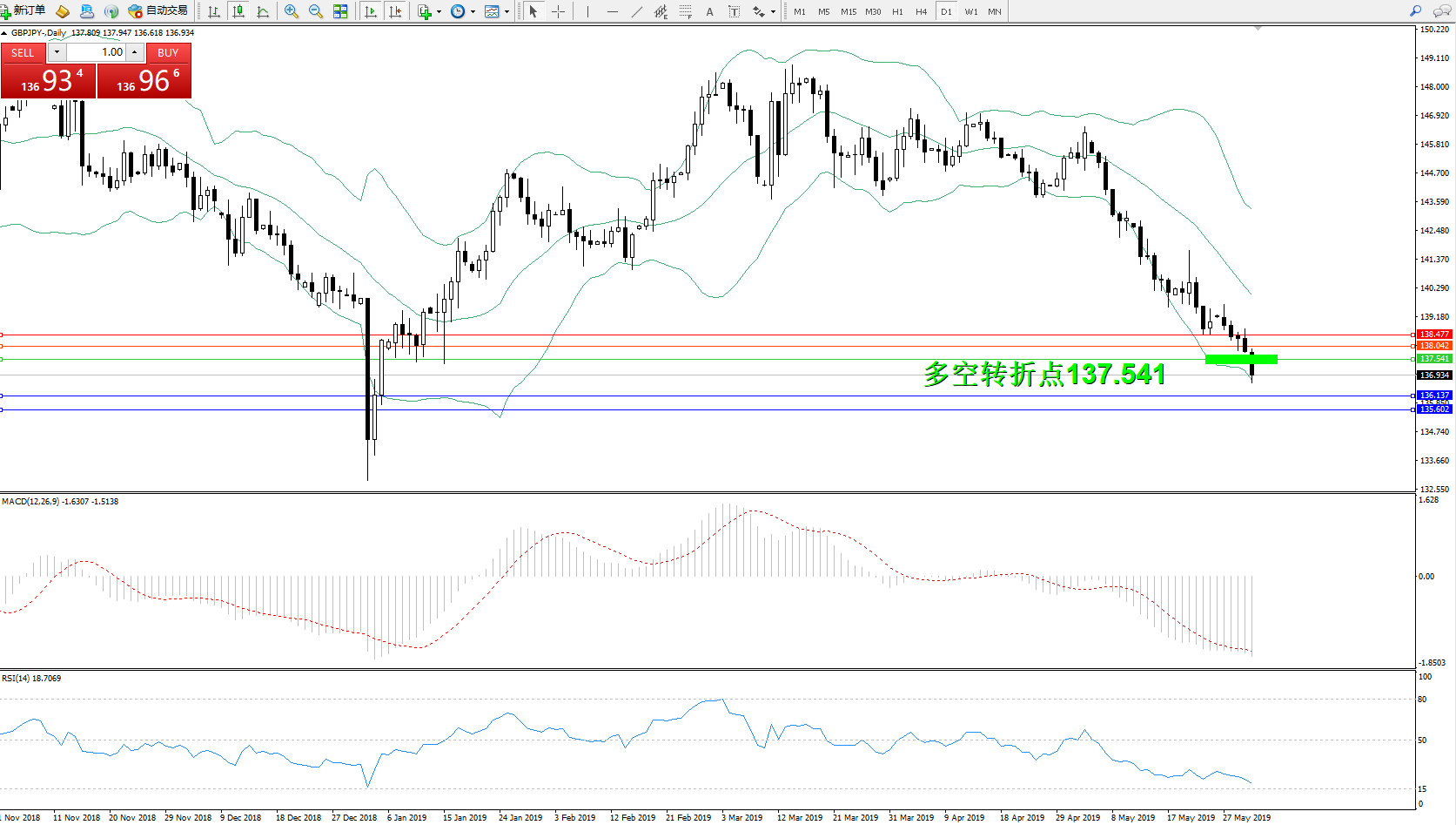 交易策略:137.541下方看跌,目标136.137135.602