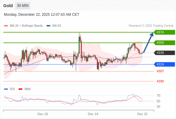 在 4319 之上,看涨,目标价位为 4356 ,然后为 4374 。
