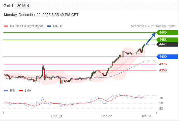 在 4400 之上,看涨,目标价位为 4456 ,然后为 4480 。