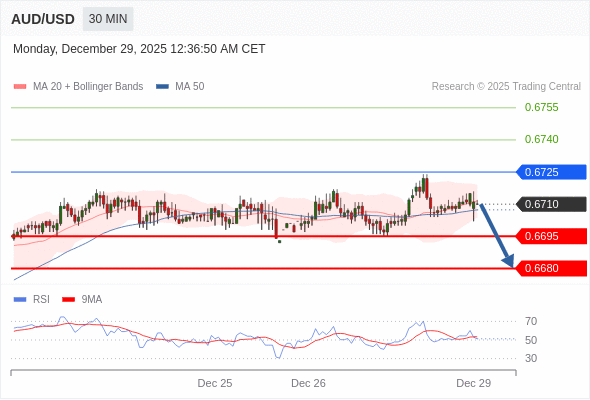 在 0.6725 之下,看跌,目标价位为 0.6695 ,然后为 0.6680 。