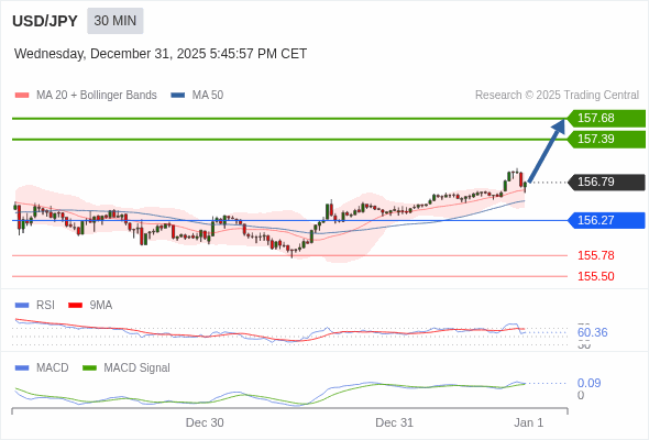 美元/日元 当日内 : 看涨,当 156.27 为支撑位。