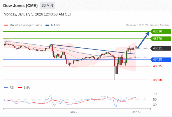 在 48425 之上,看涨,目标价位为 48770 ,然后为 48890 。