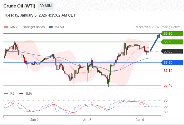 在 57.50 之上,看涨,目标价位为 58.50 ,然后为 58.90 。