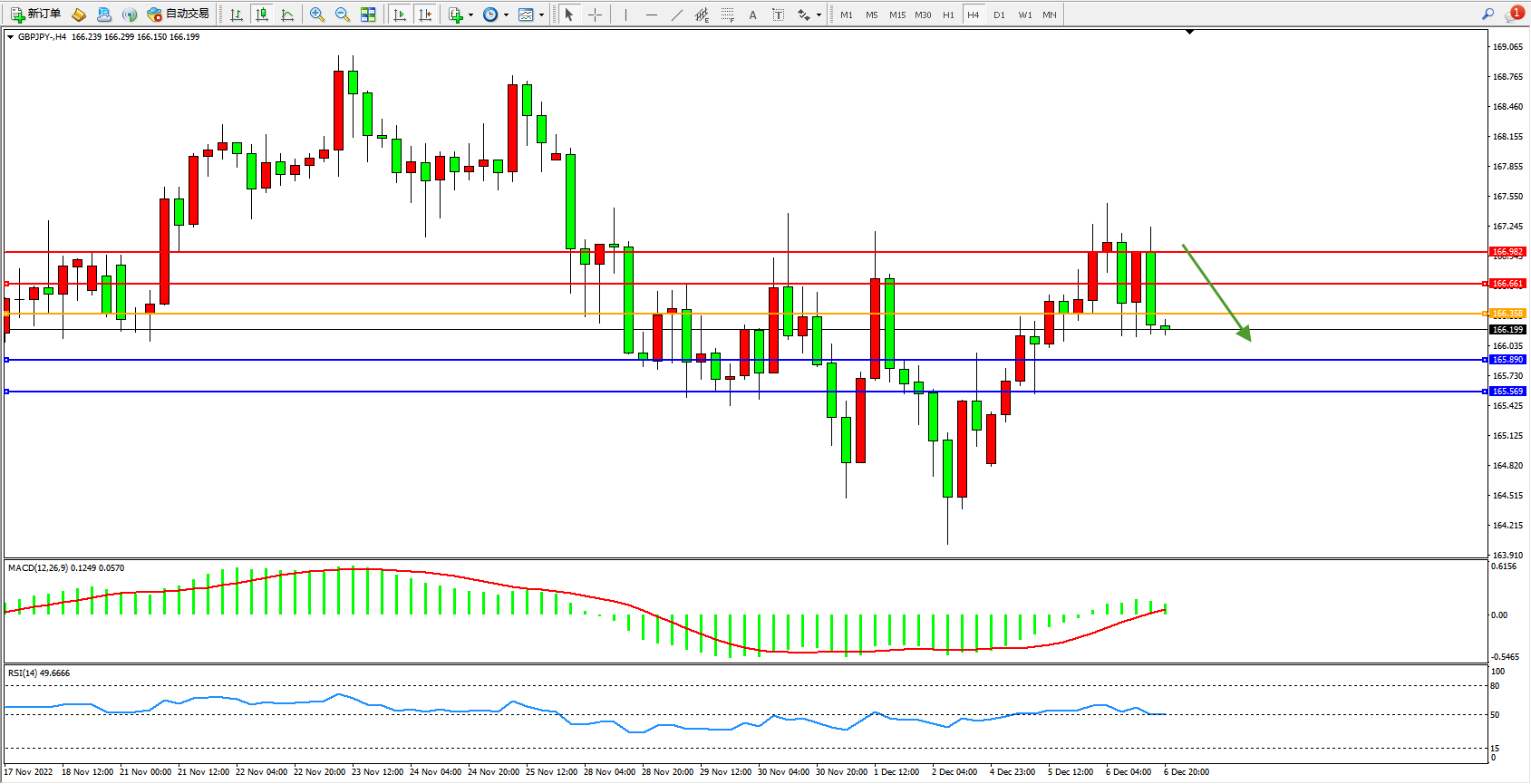 备选策略:166.358上方看涨,目标166.661、166.982