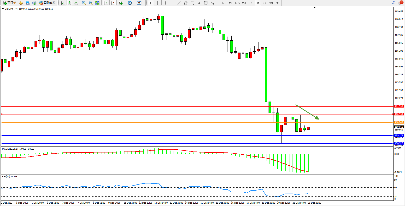 交易策略:160.266下方看跌,目标159.179、158.527