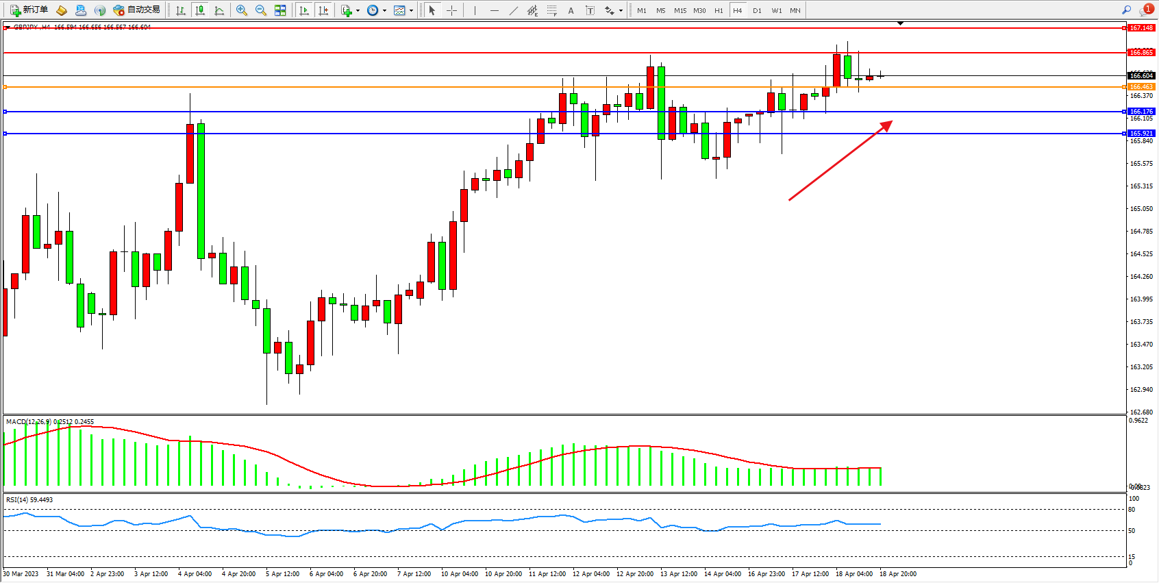 交易策略:166.463上方看涨,目标166.865  167.148