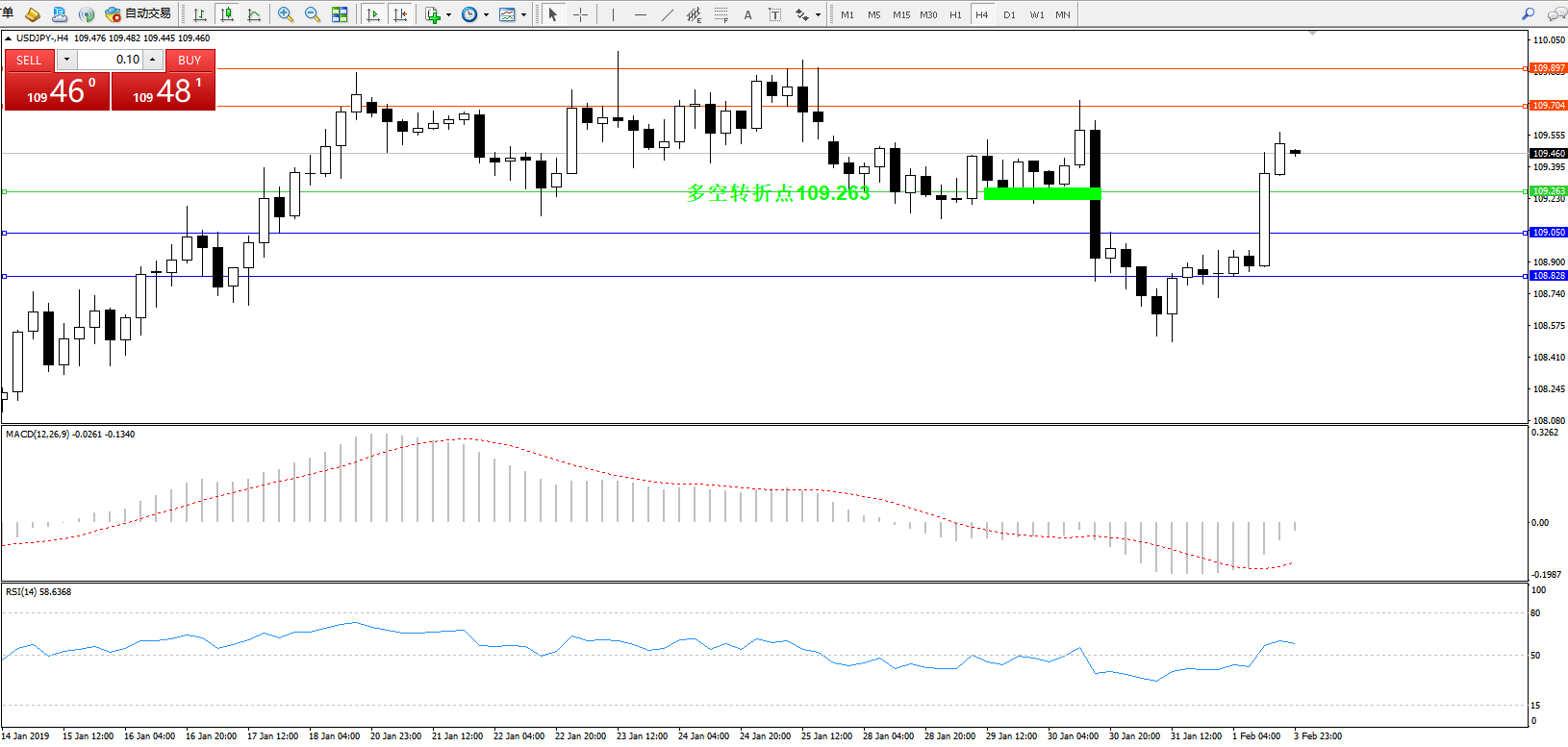 美元兑日元上周呈现探底回升的走势,一度日线级别六连阴,最低曾触及108.49,最终收报109.50,周线基本收平;因为1月美国制造业指数从12月的54.3升至56.6,也令美元对于提供支撑。美国经济学家Michael Pearce表示,ISM制造业指数反弹,进一步确认经济增长在2019年初保持稳健;预计全球需求走弱和美元走强将合力在2019年给制造业构成拖累,但很明显,制造业活动并没有跌落悬崖。