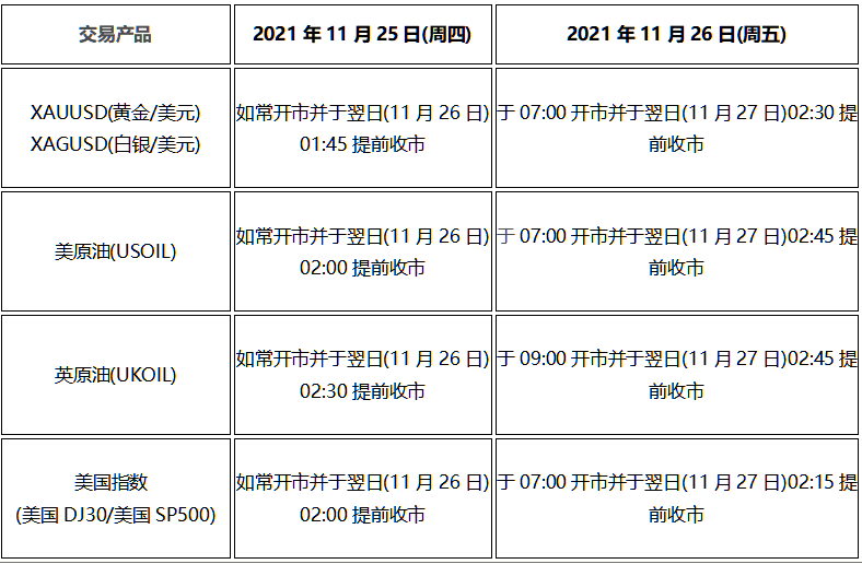 因应2021年11月25日(周四)及11月26日(周五)为美国感恩节假期,本公司以下产品的交易时间将于假期期间作以下安排,敬请留意。